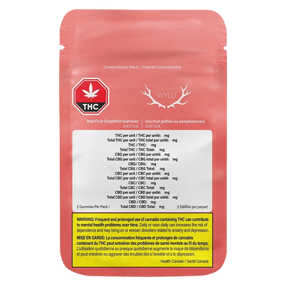 Wyld Grapefruit Sativa Enhanced THC:CBG:CBC gummies are a 1:1:1 ratio product featuring a balanced dose of three cannabinoids for an uplifting, energetic experience. Made sustainably using real fruit, botanical terpenes, and natural flavours, each gummy contains 5mg THC, 5mg CBG, and 5mg CBC for a total of 10mg THC, 10mg CBG, and 10mg CBC per pack. All Wyld gummies are packaged in a compostable pouch, and our recipes are formulated by food scientists to provide consistent experiences that taste amazing. Wyld gummies use sunflower lecithin to improve bioavailability and onset time and are made to be thermostable up to 55 degrees celsius, with a firm texture that doesn't stick to your teeth. Each Wyld Grapefruit Sativa Enhanced gummy contains the terpenes limonene, valencene, alpha-pinene, and beta-pinene for an energetic and uplifting experience. Wyld is proud to be a Climate Neutral Certified brand.