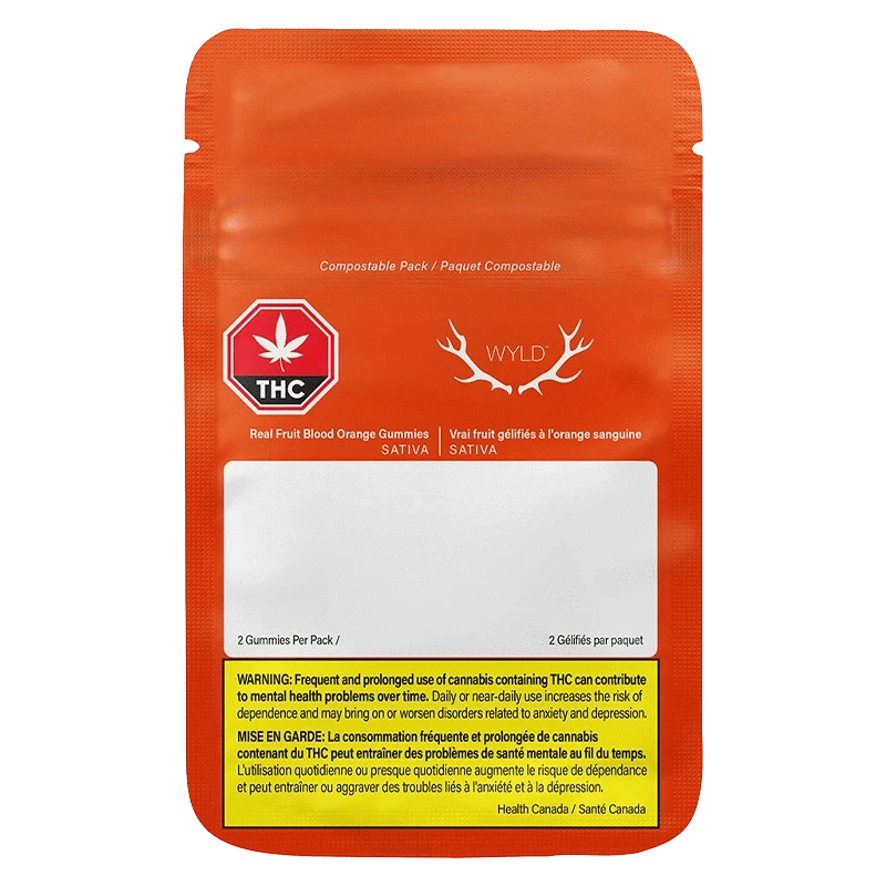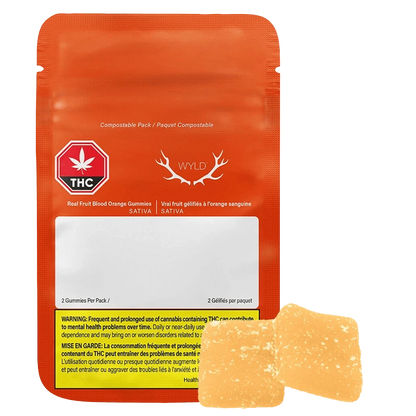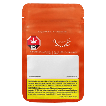 Wyld Blood Orange Sativa Enhanced CBC:THC gummies are a 3:1 ratio product featuring a CBC-dominant dose with THC for a blissful and inspired experience. Made sustainably using real fruit, botanical terpenes, and natural flavours, each gummy contains 15mg CBC and 5mg THC for a total of 30mg CBC and 10mg THC per pack. All Wyld gummies are packaged in a compostable pouch, and our recipes are formulated by food scientists to provide consistent experiences that taste amazing. Wyld gummies use sunflower lecithin to improve bioavailability and onset time and are made to be thermostable up to 55 degrees celsius, with a firm texture that doesn't stick to your teeth. Each Wyld Blood Orange Sativa Enhanced gummy contains the terpenes limonene, valencene, alpha-pinene, and beta-pinene for an energetic and uplifting experience. Wyld is proud to be a Climate Neutral Certified brand.