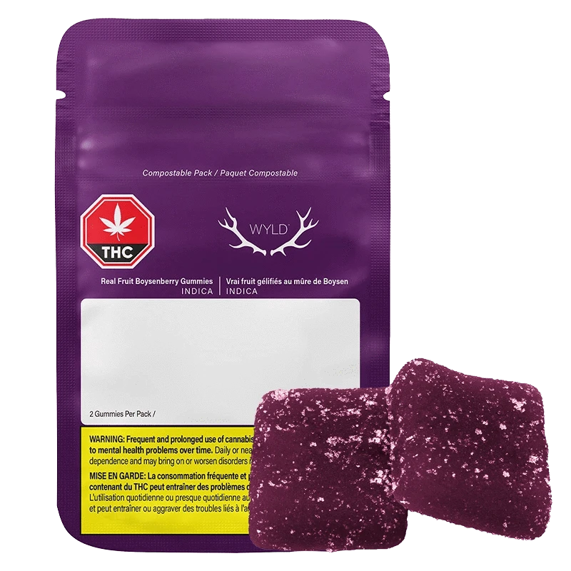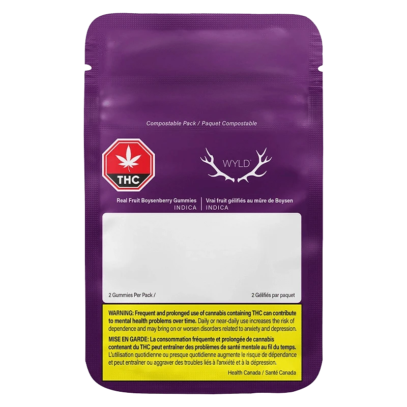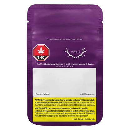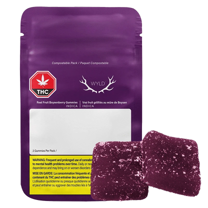 Wyld Boysenberry indica-enhanced CBD:THC:CBN soft chews are a 2:1:1 ratio product featuring a CBD-dominant dose of three cannabinoids. Made sustainably using real fruit, botanical terpenes, and natural flavours, each soft chew contains 10mg CBD, 5mg THC, and 5mg CBN for a total of 20mg CBD, 10mg THC and 10mg CBN per pack. All Wyld soft chews are packaged in a compostable pouch, and our recipes are formulated by food scientists to provide consistent experiences that taste amazing. Wyld soft chews use sunflower lecithin to improve bioavailability and onset time and are made to be thermostable up to 55°C, with a firm texture that doesn’t stick to your teeth. Each Wyld Boysenberry indica-enhanced soft chew contains the terpenes myrcene, linalool, beta-caryophyllene, and terpineol. Wyld is proud to be a Climate Neutral Certified brand.