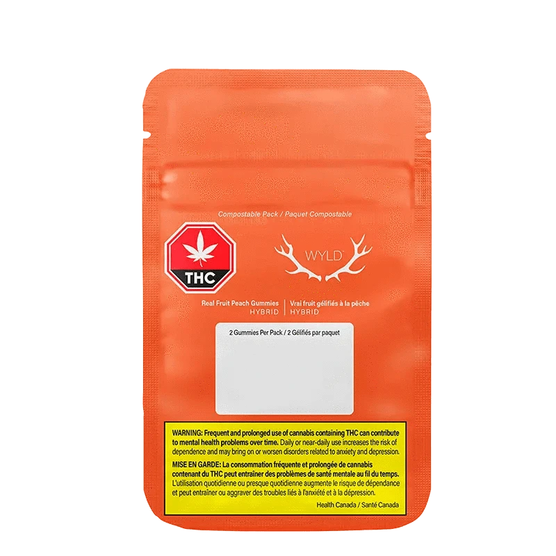 Wyld Peach Hybrid + CBD soft chews are sustainably made using real fruit, botanical terpenes and natural flavours. Our recipes are formulated by food scientists to provide consistent experiences that taste amazing. Wyld soft cvhews use sunflower lecithin to improve bioavailability and onset time, and are made to be thermostable up to 60 degrees Celsius, with a firm texture that doesn't stick to your teeth. Each Wyld Peach Hybrid + CBD soft chew contains 5mg of THC and 25mg of CBD, combined with the terpenes limonene, linalool, alpha-pinene, and beta-pinene. Wyld uses compostable packaging and carbon-neutral manufacturing to support a healthy planet. Two pieces per pack.