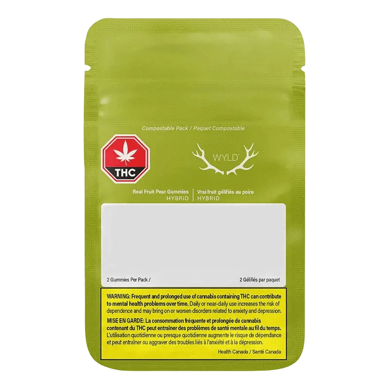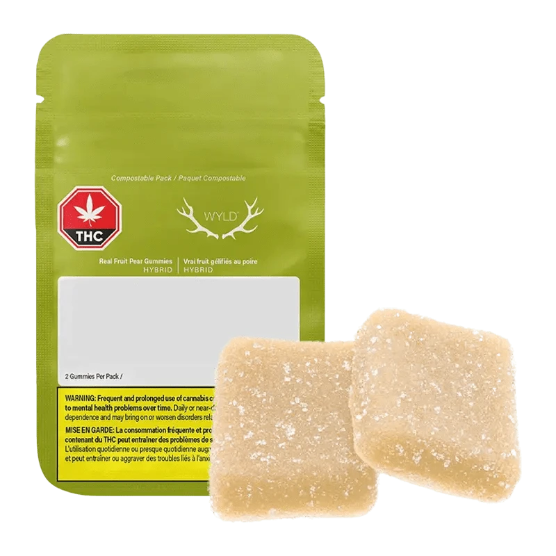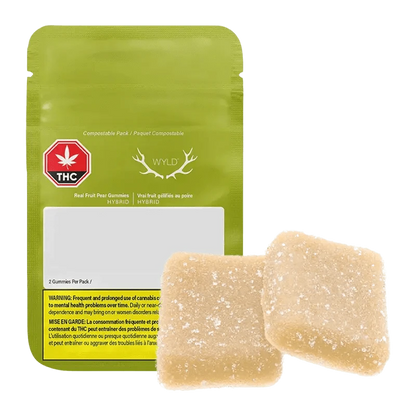 Wyld Pear Hybrid Enhanced THC:CBG soft chews are a 1:1 product featuring a balanced dose of CBG. Made sustainably made using real fruit, botanical terpenes and natural flavours. Each soft chew contains 5mg THC and 5mg CBG, for a total of 10mg THC and 5mg CBG per pack. All Wyld soft chews are packaged in an all-new compostable pouch, and our recipes are formulated by food scientists to provide consistent experiences that taste amazing. Wyld soft chews use sunflower lecithin to improve bioavailability and onset time and are made to be thermostable up to 60 degree celcius, with a firm texture that doesn't stick to your teeth. Each Wyld Pear Hybrid Enhanced soft chew contains 5mg THC and 5mg CBG combined with the terpenes limonene, linalool, alpha-pinene, and beta-pinene for a balanced, euphoric experience. Wyld uses carbon neutral manufacturing to support a healthy planet.