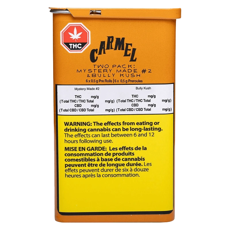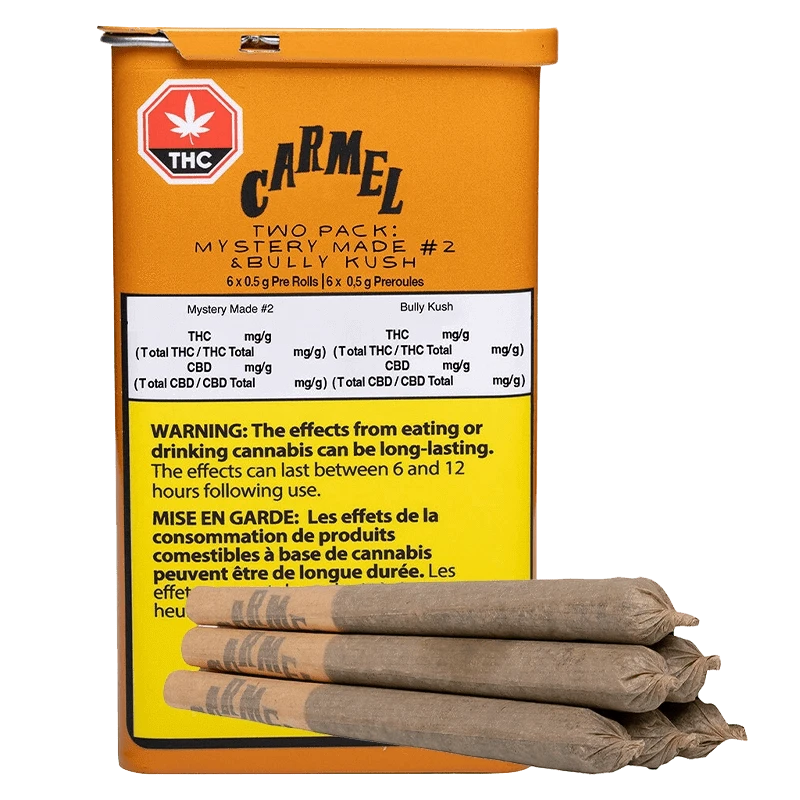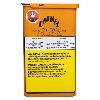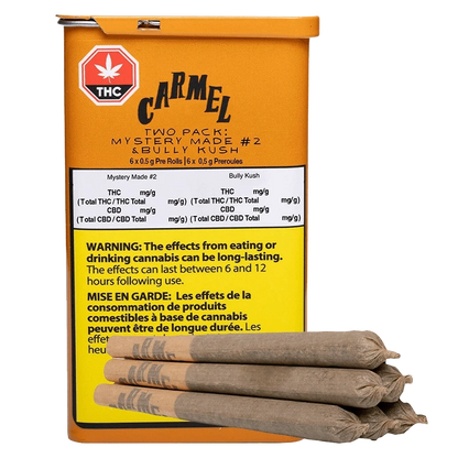Two strains conveniently available in a 6 pack tin of pre-rolls. Up first is Mystery Made 2. Mystery Made 2 is a cross of Jealousy and RS11 and was selected for it's pungent notes of gas, just enough sweet and a little fruit. Up next is Bully Kush. Bred by Seed Junky Genetics, Bully Kush is a cross of Triangle Kush x TKBx2. With this heavy hitter expect dense nugs that deliver notes of Gas, Kush & Berries. As you'd expect, all our pre rolls are made exclusively of whole flower and are packed in a tin with a humidity pack.