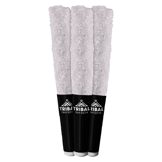 Tribal Trifecta. When your journey is of the utmost importance, you equip yourself with the best gear. No fake terpenes and no distillate. Tribal Trifecta G Mint Infused pre-rolls start with Gelato Mint flower that is triple infused with Gelato Mint live resin, terp sauce and THC-A diamonds. Rolled in a hemp paper and finished with a ceramic tip. Live resin, terp sauce and THC-A diamonds make the Tribal Trifecta.