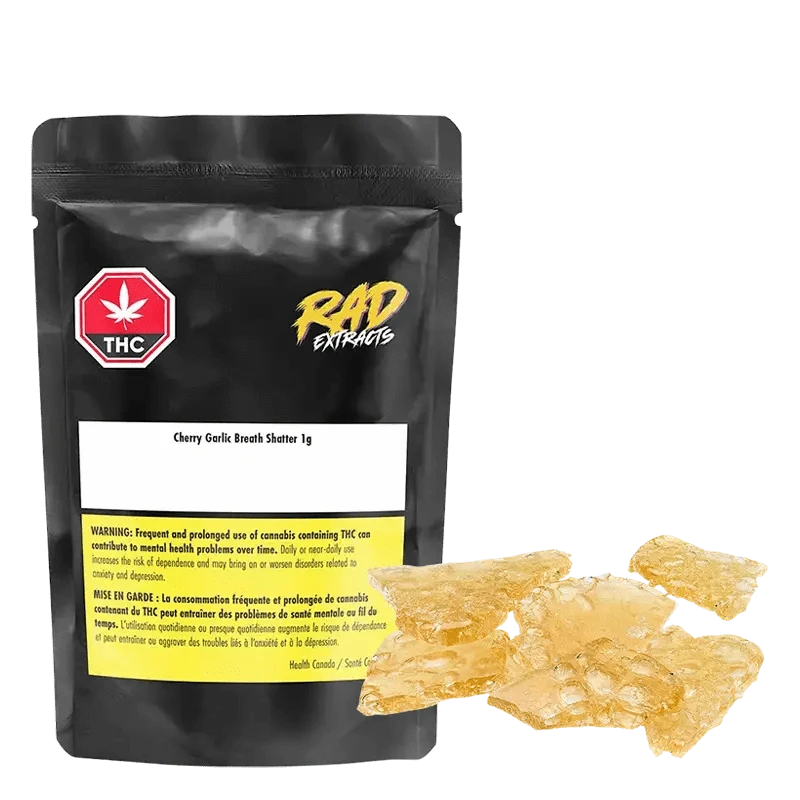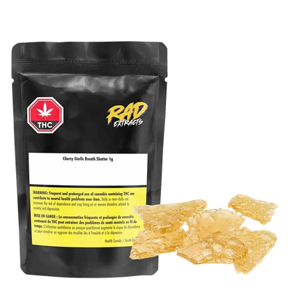RAD Cherry Garlic Breath shatter is produced via hydrocarbon extraction to produce a radically golden and brittle concentrate...