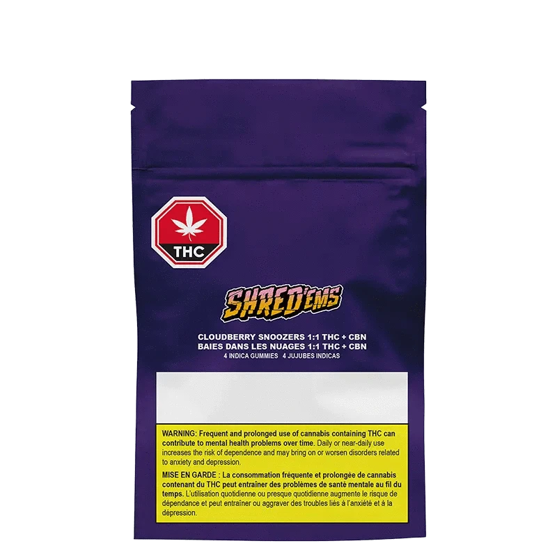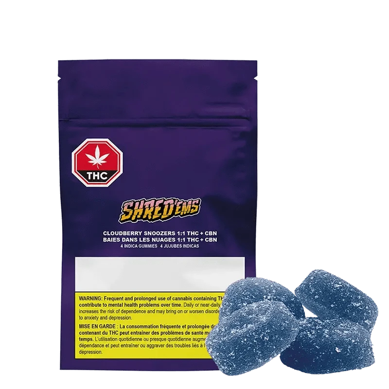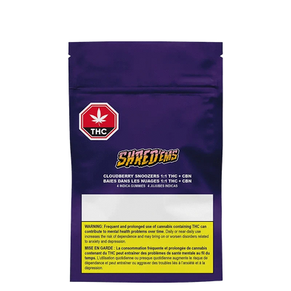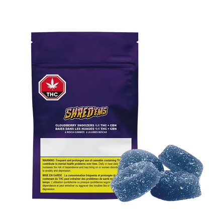 THC: 10.00 mg CBD: 0.00 mg -- Don’t sleep on Cloudberry Snoozers! This new SHRED’ems features a unique cloudberry and hibiscus flavour profile, as well as some CBN for those seeking some minor cannabinoids in their THC soft chews. Cloudberry Snoozers are indica dominant and contain 10 mg of THC and 10mg of CBN per pack.