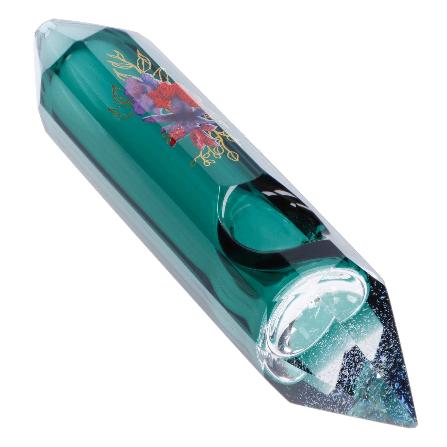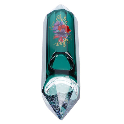 The Floral Lush hand pipe is made from thick, handblown borosilicate glass. This transparent teal, crystal shaped pipe...