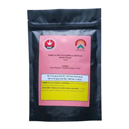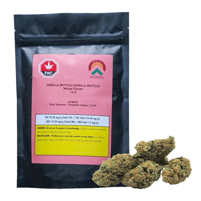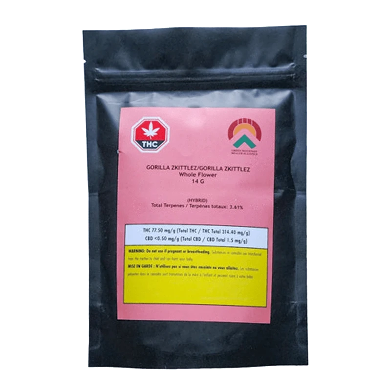Introducing Green Mountain Health Alliance's - Gorilla Zkittlez dried flower. This BC Okanagan Valley grown flower creates a captivating blend of spicy artisan chocolate, aromatic herbs, and fresh blossoms, creating an aroma that is truly heavenly. With lineage stemming from the esteemed Original Glue & Zkittlez cultivars, Gorilla Zkittlez inherits these qualities while adding its own unique flair, promising to astonish and delight even the most discerning cannabis connoisseurs. Gorilla Zkittlez boasts an impressive total terpene content of 3% and over, with beta-caryophyllene, humulene, and selinadienes.
