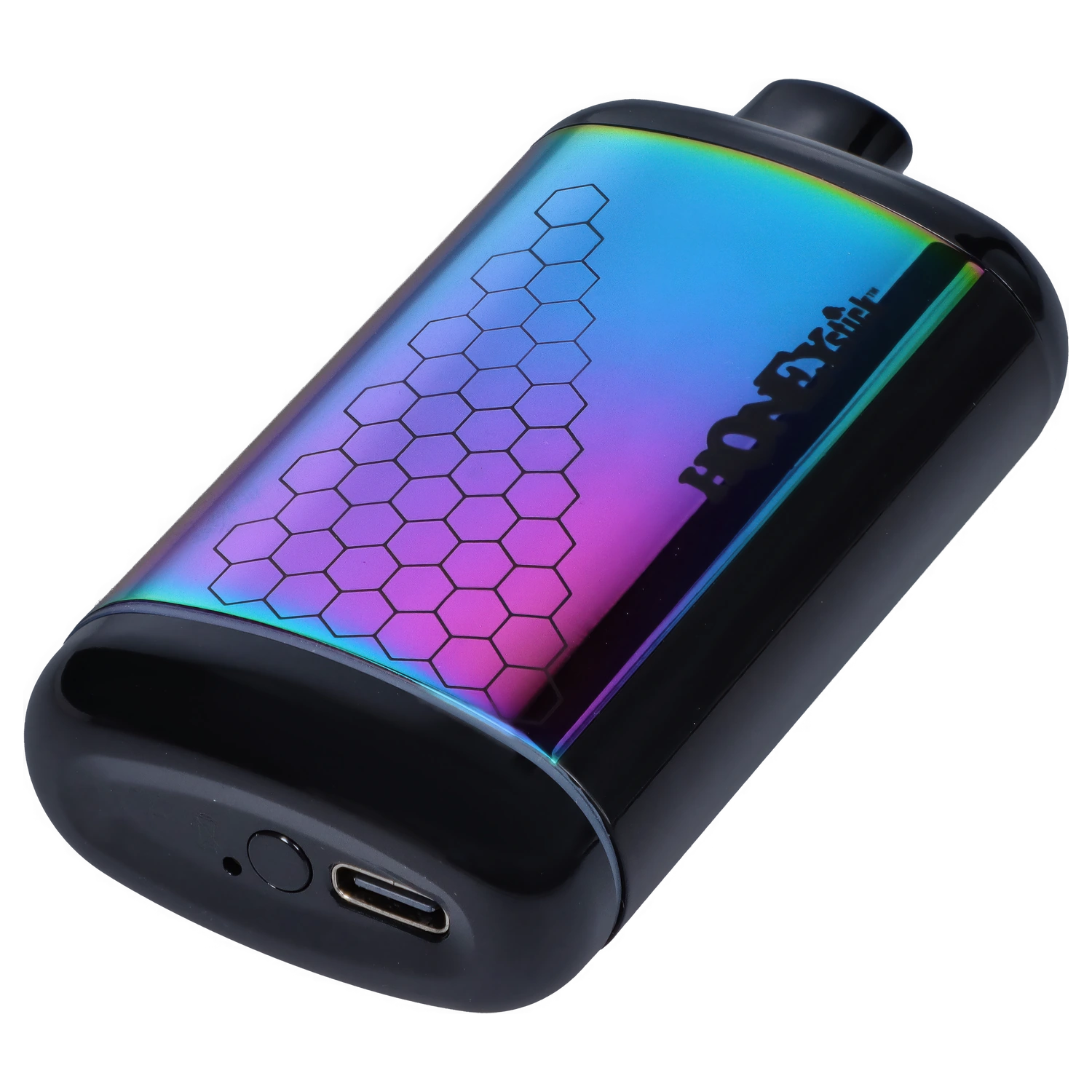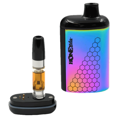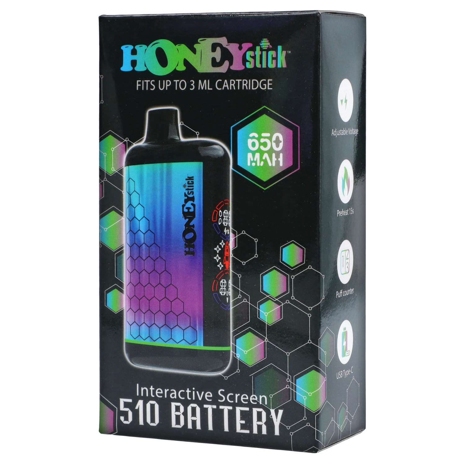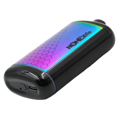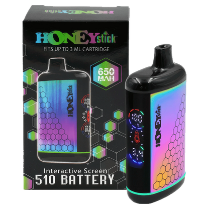 The Interactive Battery from HoneyStick is a sleek draw-activated 510 cart pen. Your cart comes to life with each draw and shows stats on the interactive hi-res screen. You'll find voltage, battery life and current operations like the 15 second preheat. When you want to use the preheat function click the button twice quickly and the screen will display a blinking red rocket and 1.8V. If you want to use one of the preset temperatures click 3 times to bop between 2.8V, 3.4V and 3.8V (this will show on the screen as well as the coloured band at the base). This fits carts up to 3ml! However, only cartridges with bottom base airflow holes will work. The 650 mAh battery will last for a while and it can be charged through the USB-C port (charger not included).