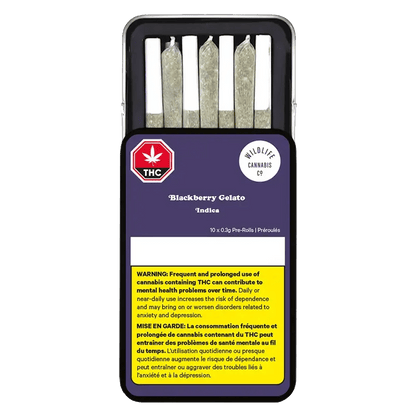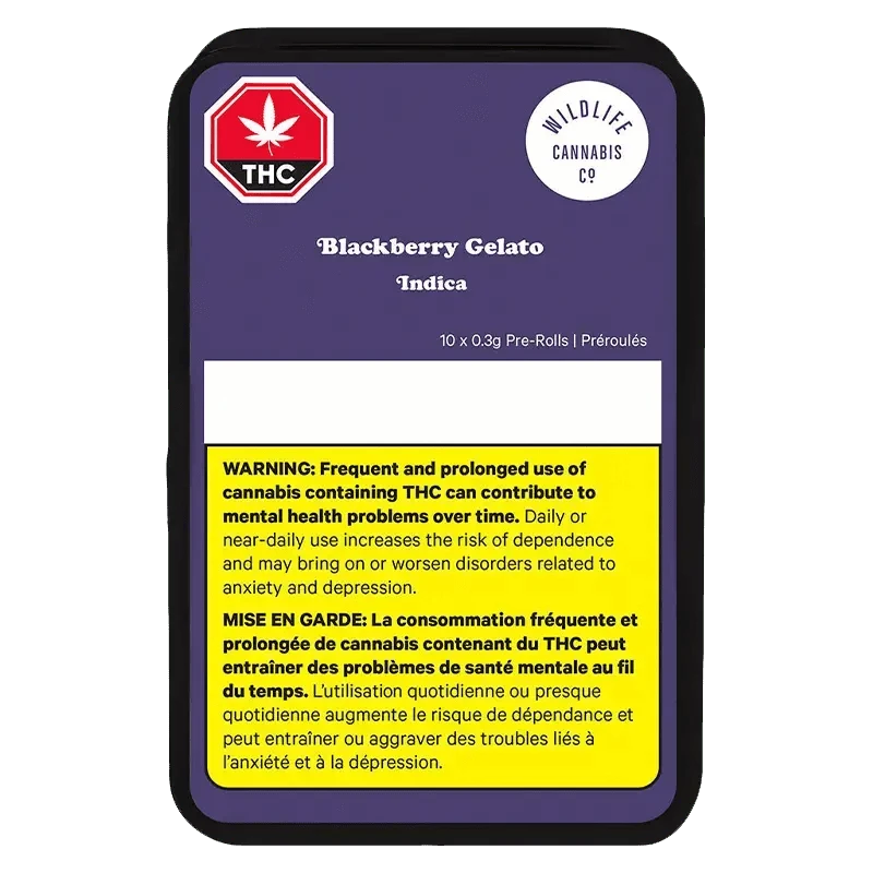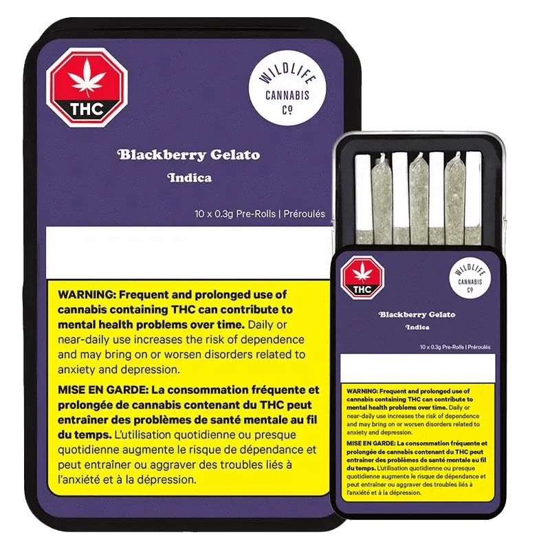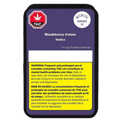 Our Blackberry Gelato pre-roll smells like a freshly-iced blackberry toaster strudel - fruit-forward, with undertones of fuel, Canadian maple, and mulled spices. Wildlife pre-rolls are rolled from whole buds, never shake. We remove sticks and stems by hand, and finish with a hand twist for quality assurance. Our processing rooms' environments are set to ensure minimal moisture loss. A crowd favourite, this easy-smoking cultivar has a THC range of 20-24%, with a Trans-Caryophyllene-dominant terpene profile to add a hint of black pepper and spice. Limonene, Farnesene and Linalool exaggerate the light-but-fruity overall flavour, rounded out with Humulene and Guaiol. The ripe flowers are round, very dense, and sticky - especially once cured. Visually, they're a west coast rainforest green, with hints of dark purple throughout, contributing to the cultivar name. This in-house bred cultivar is the result of a cross between a Jordan Of The Islands Blackberry Kush & Jet fuel Gelato.