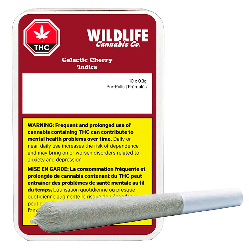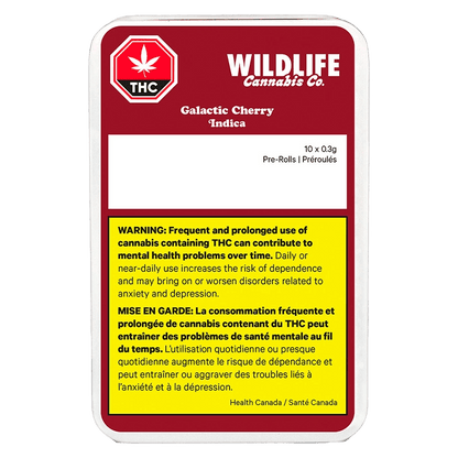 The gassy sweet notes of cherry pie, grapes and meringue in this indica Galactic Cherry. This flavourful cross is sweet with a spicy, earthy finish on exhale. Wildlife pre-rolls are rolled from whole buds, never shake. We remove sticks and stems by hand and finish each pre-roll with a twist. Packaged in a recyclable tin with a freshness seal to maintain quality.