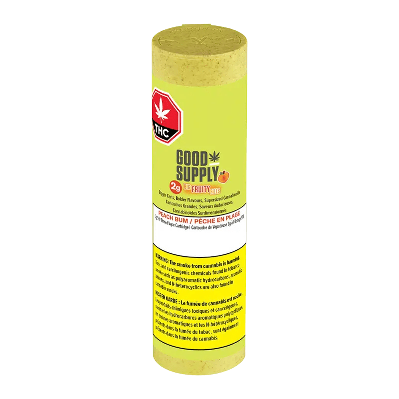 Peach Bum 2g 510 Vapes are your new go-to for all-day puffs with bigger carts, bolder flavours and supersized cannabinoid content. The sweet peach, creamy and fruity flavours of Peach Bum are taken to the max with 16% natural flavouring for bold, amped-up flavour you'll savour.. Bring home a whopping 1,600mg total cannabinoids, including 1,000mg THC in a 2g fill, so you can spend less time refilling and more time chilling. We cleverly curated this 50% THC, 15% CBG and 15% CBD formulation for a chill, uplifting and daytime-friendly experience. And with a wider mouthpiece for less clogging, you'll be ready for 24/7 heavenly hits with big clouds and smooth, satisfying flavour. The relaxing vibes of Peach Bum 2g 510 Vapes are ready to rock around the clock.
