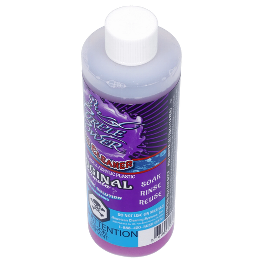 Purple Power Ultra is a shaking style cleaning solution. It's safe to use on a variety of materials like glass, acrylic and metal. This no scrub formula allows you to place what needs cleaning into the solution for 30 seconds (soak or shake!) and then rinse thoroughly. Repeat if need be and then let air dry. Purple Power Ultra can be re-used. It can even be mixed with rock salt for heavy duty cleaning jobs. Available in 16oz solution.