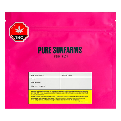 Pure Sunfarms' cut of Pink Kush from BC's Vancouver Island is a coastal relative of the legendary OG Kush. This special strain is beloved across Canada for its strong aromas, colourful flowers and high THC potential. Beneath a thick coating of trichomes, the dense and round buds feature forest green leaves, often with a purple hue, mixed with dark amber pistils. Grown in a high-tech greenhouse in the Fraser Valley, each bud is carefully trimmed and hand-groomed, dried and cured to precise standards. Pink Kush showcases gassy aromas of white pepper, orange, butterscotch, coffee, earth and grapefruit, the result of a rich combination of terpenes that includes caryophyllene, myrcene, humulene, bisabolol, and limonene.