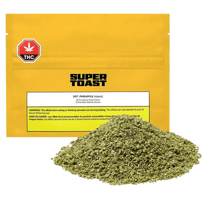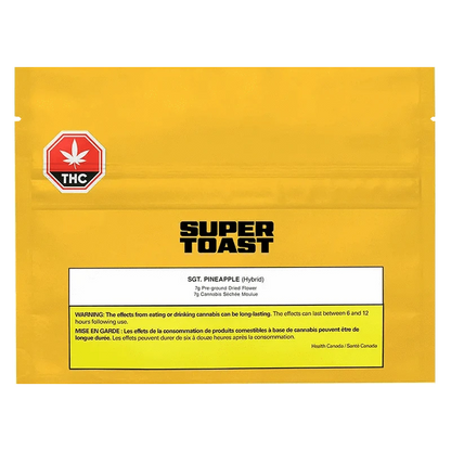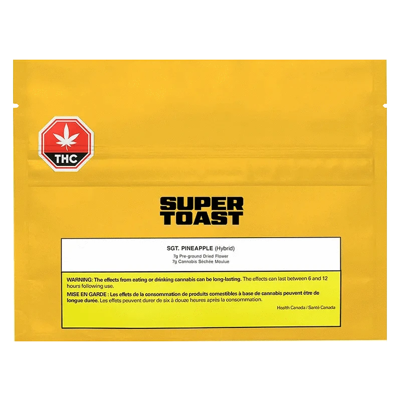 Super Toast's Sgt. Pineapple, reporting for doobie. Full of sweet, vibrant tropical aromas. 7g of potent bud, ground from whole hybrid flower. Fluffy and fresh, no grinder necessary. Always ready. Smoke it, roll it, pack it. Super Toast. Best thing since sliced bread.