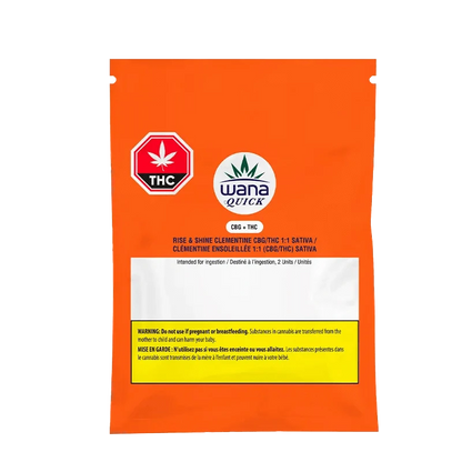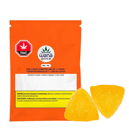 Good morning, sunshine! Wana Quick Rise & Shine Clementine 1:1 Sativa soft chews are bursting with sweet, juicy clementine flavour and infused with CBG, THC and a proprietary sativa terpene blend, Rise & Shine Clementine soft chews are made with a culinary innovation that may result in a quicker onset and offset of effects. Each soft chew contains 5 mg CBG and 5 mg THC. 2 soft chews per package. Made without animal products or gluten.