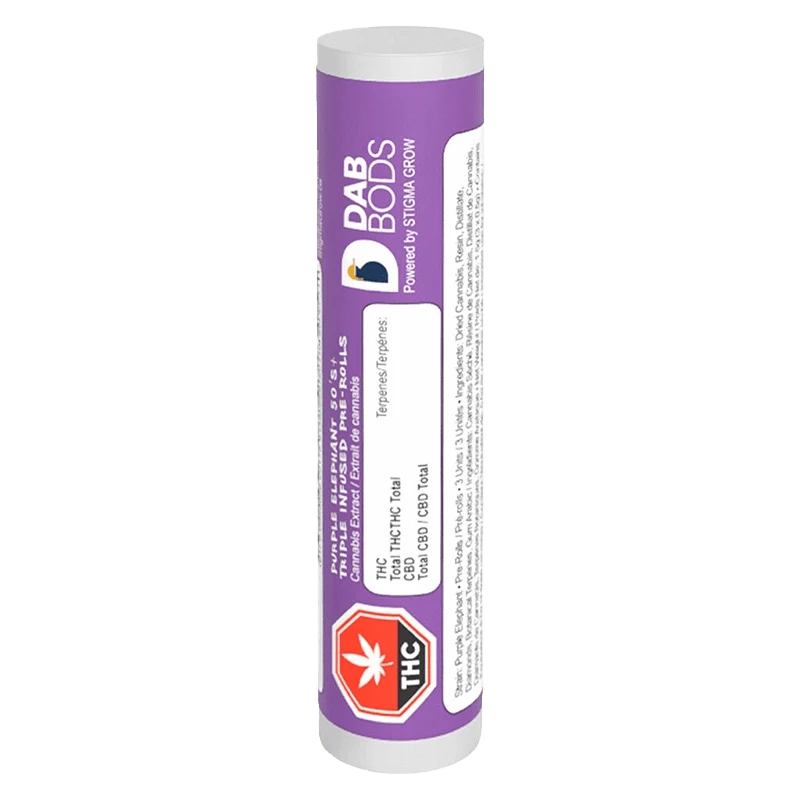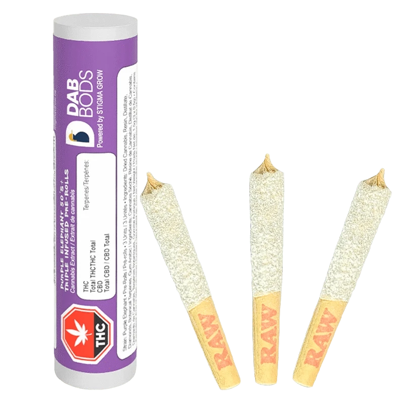 Discover the ultimate cannabis experience with Dab Bods Purple Elephant 50's+ Triple Infused Pre-Rolls. These meticulously crafted 0.5g...