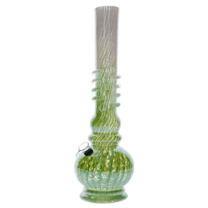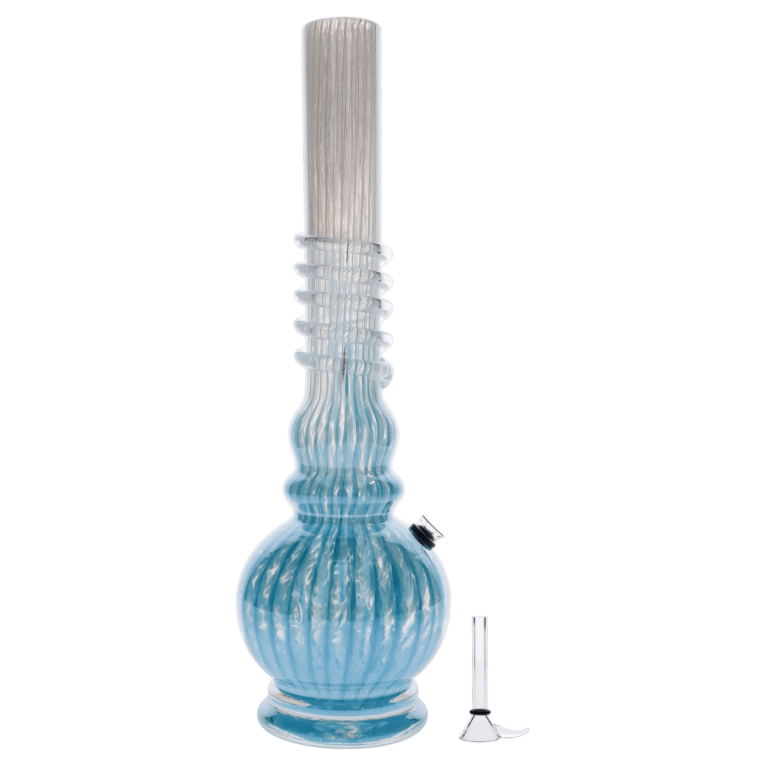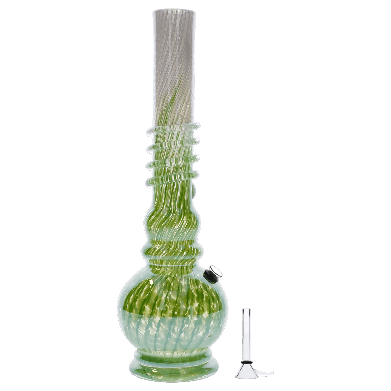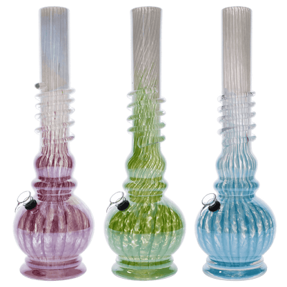 Soft glass slays. Utilizing amazing colours and cool wrapping techniques, these soft glass pieces are satisfyingly smooth. Towering at 18 inches tall, they have super long tubes and a solid base. Removing and cleaning your bowl is easy with the classic glass o-ring fitted bowl’s handle. Available in an assortment of captivating colours.