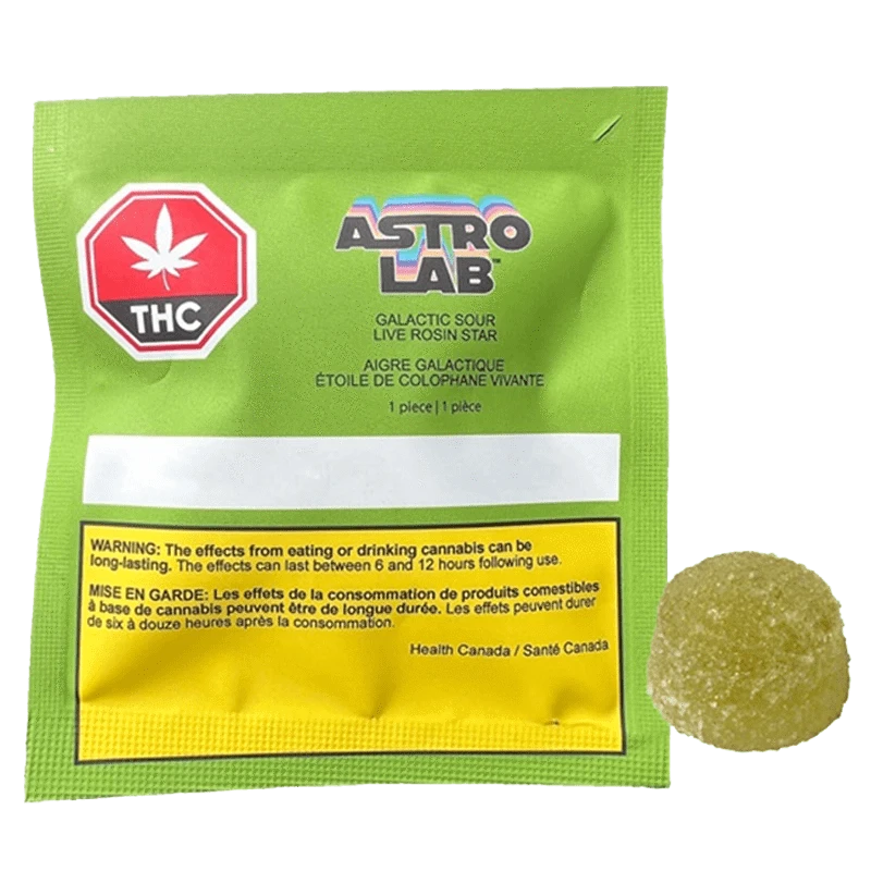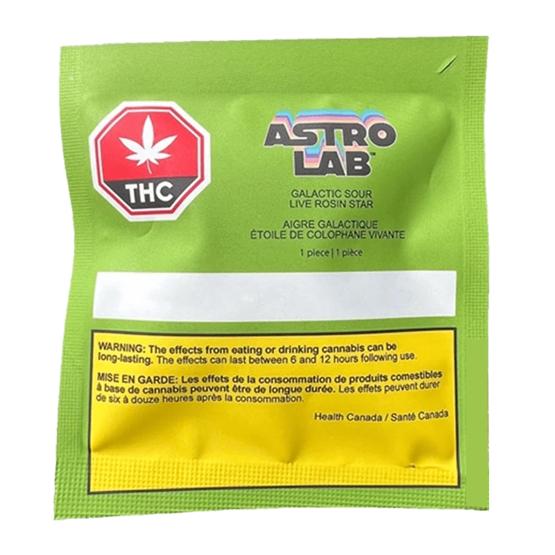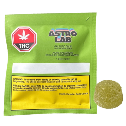 Embark on a cosmic journey with Astrolab's Galactic Sour Live Rosin Star. This 10mg single-piece edible packs the...
