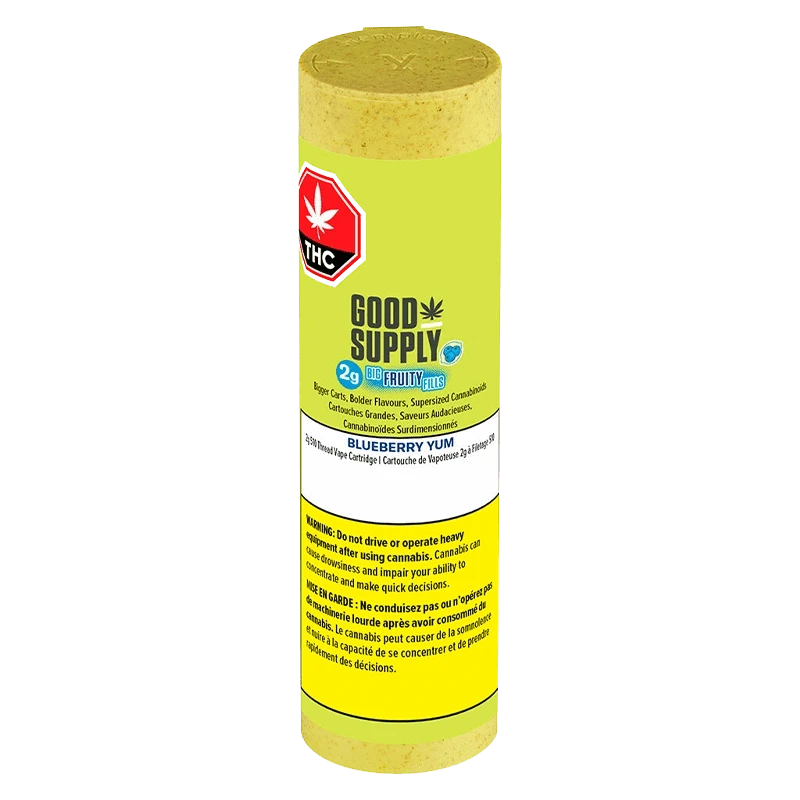 Get that Blueberry Yum now in a 2g vape. Bodacious blueberry, luscious lemon, and vibrant vanilla. The extra-large 2g fill is specially formulated with a delicious cannabinoid-packed extract with 1,000mg THC, up to 300mg CBG, and 300mg CBD, and over 2x the natural flavouring found in their 1g vapes. Super session-able and supremely tasty, Blueberry Yum 2g Vapes feature reliable hardware and wider mouthpieces to improve airflow and reduce clogging. They double-distill and double-filter the THC distillate for superior quality flavour and potency. Made with botanically sourced ingredients and flavouring agents.
