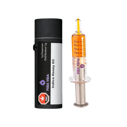 Pura Vida’s 1g Indica Honey Oil Dispenser contains concentrate that's been carefully extracted from the highest quality, hand selected indica flower. This all-glass dispenser multi-tool is heat resistant and safe for use for: applying it directly into dab rigs and dab pens, taken orally, applied topically, or adding full-spectrum concentrates to anything else – rolling papers, refill vape carts, and more. Our proprietary extraction preserves its distinctive sweet vanilla and perfume flavours. Understand the process, know the ingredients, demand the best!