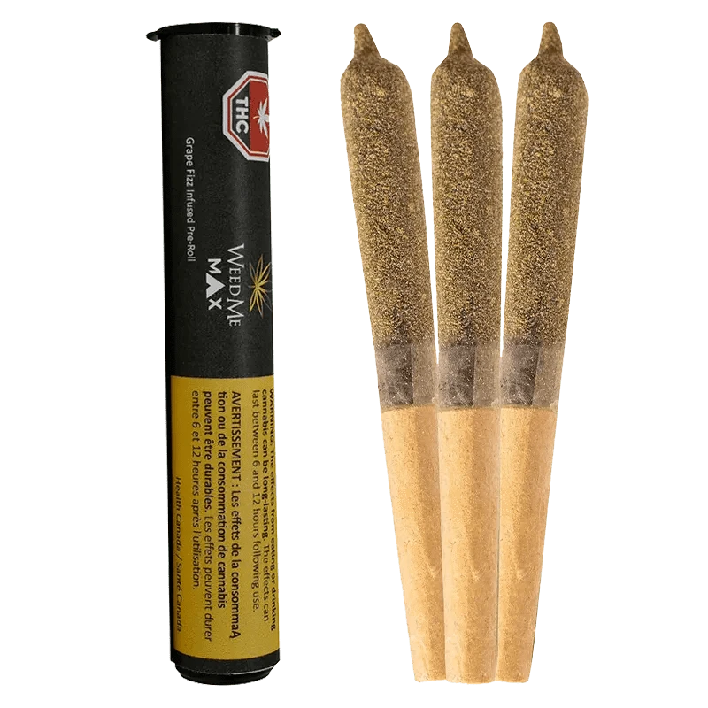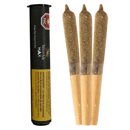 Grape Fizz by Weed Me MAX is a sativa dominant pack of distillate infused pre-rolls featuring rotating strains...
